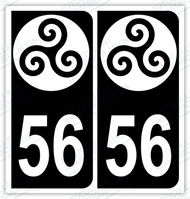 Auto - Sticker immatriculation 56 - Triskell est le choix idéal pour afficher fièrement vos origines bretonnes sur votre véhicule. Ce autocollant d’immatriculation Morbihan met en valeur le Triskell celtique, symbole emblématique de la culture bretonne, et offre à votre voiture une touche d’authenticité unique.